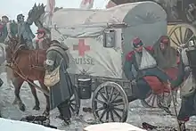 The subject of the painting is the movement of French General Charles-Denis Bourbaki's Armée de l'Est to neutral Switzerland in February 1871, at the end of the Franco-Prussian War. Bourbaki's army had been defeated during the 15–17 January Battle of the Lisaine, whilst unsuccessfully attempting to relieve the Siege of Belfort, so they sought internment in neutral Switzerland. Some 88,000 men marched into Switzerland via Les Verrières, abandoning 11,000 horses, 1,150 wagons, 285 artillery pieces, 7,200 rifles and 64,000 bayonets. The wounded received care from the Swiss Red Cross and local villagers.[1] The interned men were released back to France after six weeks.[2]