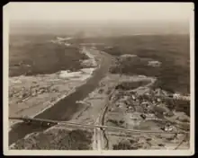 Work on the bridge began on August 10, 1910, during construction of the Cape Cod Canal.[2] The bridge abutments were completed by December.[3] In April 1911, the bridge was reported as being nearly completed.[4] Reports at that time noted that once the new bridge was opened, an existing bridge over the Monument River in Bourne would be closed.[5] On May 20, the bridge was physically opened (lifted) for the first time.[6] In late June, the bridge was described as "ready", with plans being made for its immediate opening.[7]