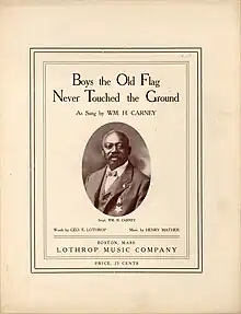 "Boys the Old Flag Never Touched The Ground" is a patriotic song that was sung at events about the Medal of Honor recipient Sgt. William H. Carney of the 54th Massachusetts Volunteer Infantry. The song was written by Bob Cole, James Weldon Johnson, and J. Rosamond Johnson and was sung in their Broadway musical "Shoo Fly Regiment." It was published in 1901. They dedicated the song to Carney.