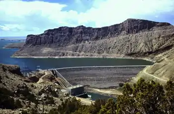 Boysen Reservoir is a reservoir formed by Boysen Dam, an earth-fill dam on the Wind River in the central part of the U.S. state of Wyoming. It is near the town of Shoshoni in Fremont County. The dam was constructed between 1947 and 1952 at the mouth of Wind River Canyon, just upstream from a previous dam that had been built by Asmus Boysen in 1908 on land he had leased from the Shoshone and Arapaho tribes. The dam and much of the reservoir are physically located on the Wind River Indian Reservation.