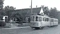 A tram passing Brønshøj Rytterskole in 1961
