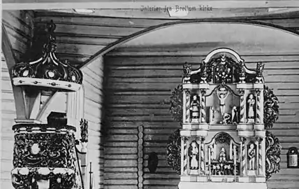 The earliest existing historical records of the church date back to the year 1370, but the church was not new that year. The first church in Brøttum was a wooden stave church. This church was likely built during the 13th century. Around the year 1411, the church was renovated and repaired. Eventually, this church fell into disrepair and needed to be replaced. In 1629, the old church was torn down and a new log building was constructed on the same site. The church got a tower in 1636 and in 1684, a new church porch with an attic was built. A crucifix was made by Jens Strammerud for this church in 1735 which now hangs in the present church. The church was extensively restored in 1729.[3][4]