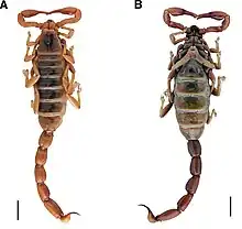 - 1 2 José A. Ochoai; André S.A. Ojanguren Affilastro (April 2007). "Systematics and distribution of Brachistosternus (Brachistosternus) ehrenbergii (Gervais, 1841), with the first record of stridulation in this genus Brachistosternus (Scorpiones: Bothriuridae)" (PDF). Studies on Neotropical Fauna and Environment. 42 (1): 61. doi:10.1080/01650520600800310. Retrieved February 5, 2014.