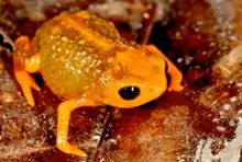 Brachycephalus boticario is a species of frog in the family Brachycephalidae. It is very tiny and was one of seven new species described by LF Ribeiro and a team of scientists from the Mater Natura - Instituto de Estudos Ambientais in Brazil. Like all species in its genus, it is found in a very small strip of Atlantic Forest in the southeastern coast of the country, and has a vibrant colour pattern.[1] The speciation seen in this genus is thought to be a byproduct of the rift between the valley versus mountain terrain and its particular microclimates, to which they are adapted. It might be in population decline due to habitat loss.[2] The species name pays homage to the Fundação Grupo Boticário de Proteção à Natureza, which partially funded the fieldwork of the study originally describing the frog.