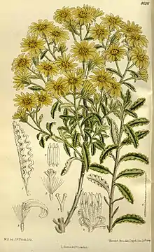 Brachyglottis monroi (Monro's ragwort;[1] syn. Senecio monroi) is a species of plant in the family Asteraceae, formerly classified in the genus Senecio. Native to New Zealand and Tasmania, it is a small, hardy, evergreen shrub growing to 1 m (3 ft 3 in) with crinkly-edged, olive green, leathery leaves and yellow daisy-like flowers in terminal corymbs in summer.[2][3][4]