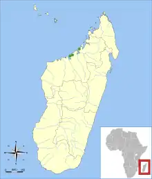 Teeth of Brachytarsomys mahajambaensis have been found at the sites of Antsingiavo, Belobaka, and Ambatomainty in northwestern Madagascar, which are late Pleistocene (126,000 to 10,000 years ago) and Holocene (less than 10,000 years ago) in age.[3] Brachytarsomys is a rare element of the rodent fauna, which is dominated by multiple species of Eliurus and Macrotarsomys.[7] Modern Brachytarsomys are large rats that live in trees and eat fruits at the middle to high altitudes. The modern, dry environment in northwestern Madagascar is decidedly inhospitable to these animals, and they no longer occur there; the former presence of B. mahajambaensis could indicate that the region was more humid in the past.[4]