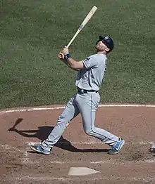 Despite improving in the middle infield in the month of July, with his last error coming on July 6, the Rays moved Miller to first base in August after acquiring Matt Duffy from the San Francisco Giants.[45] At the time, regular first baseman Morrison had been on the disabled list; when he returned, Miller remained at first base while Morrison became a designated hitter.[47] Miller capped off his breakout hitting year on September 21 in an 11–5 win against the Yankees. First, he was responsible for the second of three consecutive home runs in the third inning of the game, bookended by Evan Longoria and Corey Dickerson. In the eighth inning, Miller hit an additional solo home run to boost his season total to 30.[48] He trailed off after that, batting only .158 in his last 27 games and ending the season with an 0-for-18 slump.[1] In his first season with the Rays, Miller batted .243 and set career highs with 30 home runs and 81 RBIs.[35]