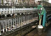 The museum also has a 24-spindle velox ring spinner which was a later development of the ring spinning frame. The passage of the yarn from the front rollers to the paper tube - used in place of a bobbin - is different from other types of spinning frames. When the yarn leaves the rollers it passes direct to the top of an elongated spindle and coils round it two or three times before forming a balloon to the ring traveller. This enables the twist to be imparted between the spindle top and roller nip, thus helping to produce a smoother yarn.[6]