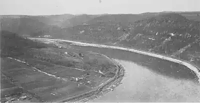 Brady's Bend, also known as Bradys Bend, is a location in East Brady, Clarion County, Pennsylvania. It is named for Captain Samuel Brady (1756–1795), frontier scout and the subject of many legends. The photo is a composite of three shots taken about 1,400 ft. above sea level. Near this location on the Allegheny River in Western Pennsylvania June 1779—in what was then Seneca territory – Brady led a force seeking to redress the killing of a settler and her four children, and the taking of two children as prisoners. The force surrounded a party of seven Indians—apparently both Seneca and Munsee – killing their leader (a Munsee warrior) and freeing the two children.[1]