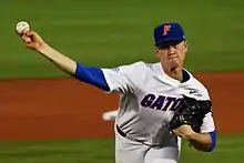 As a freshman at Florida in 2016, Singer appeared in 23 games and made one start. He finished the season 2–2 with a 4.95 ERA and 38 strikeouts in 43+23 innings.[3] After the 2016 season, he played collegiate summer baseball for the Falmouth Commodores of the Cape Cod Baseball League,[4] where he was named the best prospect by Baseball America.[5] As a sophomore in 2017, Singer moved into the starting rotation.[6][7] He was named to the All-SEC Second Team.[8] He helped lead Florida to the College World Series finals against the LSU Tigers and was the starter in game 1, in which he struck out 12 batters leading the Gators to a 4–3 win.[9][10] Florida eventually won the national title and Singer was named to the All-Tournament Team.[11] In 126 total innings for the season, Singer was 9–5 with a 3.21 ERA, striking out 129 and walking 32.[12]