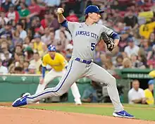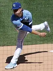 Singer was activated onto the Royals roster at the beginning of the 2020 season and made his Major League debut on July 25, 2020, against the Cleveland Indians, and pitched five innings of two-run ball in a no-decision. He was the first pitcher from the 2018 draft class to make it to the majors and second player overall after Nico Hoerner. On September 10, 2020, he allowed no hits through 7.2 innings while playing against the Cleveland Indians until he gave up a hit to Austin Hedges in the bottom of the 8th. In his next start against the Detroit Tigers, Singer fell one pitch short of an immaculate inning, when Miguel Cabrera fouled off Singer's ninth pitch of the inning. Cabrera then struck out on the next pitch. With the 2020 Kansas City Royals, Singer appeared in 12 games, compiling a 4–5 record with 4.06 ERA and 61 strikeouts in 64+13 innings pitched.[22] In 2021, Singer started 27 games for the Royals and went 5-10 with a 4.91 ERA, 131 strikeouts, and 53 walks over 128+13 innings. He opened the 2022 season in Kansas City's bullpen.[23] He was optioned to the Triple-A Omaha Storm Chasers in late April.[24]