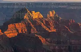 Brahma Temple is a 7,551-foot-elevation (2,302 meter) summit located in the Grand Canyon, in Coconino County of Arizona, US.[3] It is situated six miles (9.7 km) north-northeast of the Yavapai Point overlook on the canyon's South Rim, and 4.5 miles south of the North Rim's Bright Angel Point. It towers 5,000 feet (1,500 meters) above Phantom Ranch in Bright Angel Canyon. Its nearest higher neighbor is Oza Butte, four miles to the north-northwest.[1] Other neighbors include Zoroaster Temple one mile to the south, and Deva Temple, 1.5 miles to the north. Brahma Temple is named for Brahma, the Hindu creator of the universe. This name was applied by Clarence Dutton who began the tradition of naming geographical features in the Grand Canyon after mythological deities.[4] This geographical feature's name was officially adopted in 1906 by the U.S. Board on Geographic Names.[3]
