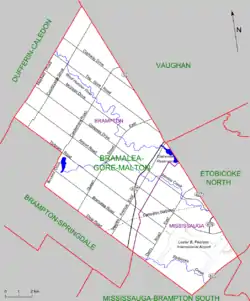 It includes the neighbourhoods of Colerane, Ebenezer, Woodhill, Bramalea and Gorewood Acres in the City of Brampton and the neighbourhoods of Malton, Marvin Heights and Ridgewood in the City of Mississauga.
