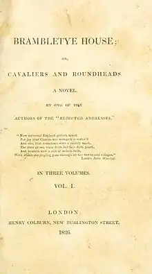 Brambletye House is an 1826 historical novel by the British writer Horace Smith, originally published in three volumes. It was published in London by Henry Colburn.[1] It takes its title from Brambletye House, a Jacobean house near Forest Row in East Sussex of which some ruins still remain. It takes place in the English Commonwealth, during the rule of Oliver Cromwell in the aftermath of the English Civil War.[2] The focus is of a country family of broadly pro-Cavalier sympathies. Although the book is largely pro-Royalist, it is less sympathetic to the post-Restoration rule of Charles II and James II.[3]