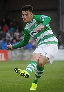 On 23 December 2014, it was announced that Miele had signed for Pat Fenlon's Shamrock Rovers side, on the same day that it was announced that ex-Ireland international Stephen McPhail had signed a new contract at the club.[5][6] Miele's debut in senior football came on 3 April 2015, when he came on from the bench in the 84th minute and in injury time he scored the third goal in a 3–0 win over Galway United at Tallaght Stadium.[7] The season turned out to be a huge success for Miele, scoring 11 league goals in 28 league games, he also played in all four of Rovers' UEFA Europa League campaign as they knocked out Luxembourg side Progrès Niederkorn[8][9] before being knocked out by Odds BK of Norway.[10][11] This form saw him voted into the PFAI Team of the Year by his fellow professionals as well as being voted the PFAI Players' Player of the Year and Shamrock Rovers Player of the Year.[12][13]