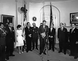 At Kennedy's request, in 1962 Goulart interceded with the Cuban government to prevent the execution of prisoners captured after participating in the Bay of Pigs Invasion.[76][lower-alpha 7] The same year, during the Missile Crisis, Kennedy demanded the withdrawal of Soviet missiles from Cuba. Jango communicated to the American ambassador his support for this decision. Lincoln Gordon evaluated this moment as a high point in a deteriorating relationship. When, on October 22, the USA convened an OAS meeting, Brazil was in favor of a naval blockade of the island, but opposed to military intervention.[77]