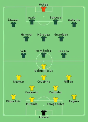 Hirving Lozano's half-volley was well blocked by Miranda, while at the other end, Guillermo Ochoa saved Neymar's drive from just outside the penalty area. After 25 minutes, Neymar raced past Edson Álvarez in the area and forced Ochoa into a save with his left hand. Gabriel Jesus went close in the 33rd minute, finding space in a crowded area and drilling in a left-footed strike that Ochoa palmed away. In the 51st minute, Neymar's back-heel on the edge of the area teed up Willian for a burst into the box and his scuffed cross from the left was slid into an empty net by Neymar from close range. With two minutes remaining, Neymar powered through on the left and his low effort was diverted by Ochoa's foot into the path of Roberto Firmino, who tapped the ball into an empty net from close range.[31][32]