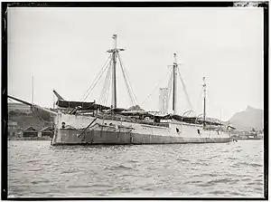 Sete de Setembro was laid down at the Arsenal de Marinha da Corte in Rio de Janeiro on 8 January 1868, during the late stages of the Paraguayan War (also known as the War of the Triple Alliance), which saw Argentina and Brazil allied against Paraguay. She was launched on 16 May 1874, after lengthy delays as to her armament, and commissioned on 4 July 1874 by which time she was obsolete.[2] She was briefly placed into reserve between August 1876 and June 1877. The ship was stationed in Montevideo during the early 1880s before she was transferred to Rio de Janeiro in 1884. Sete de Setembro was assigned to the Evolution Squadron in November 1885 despite having been reclassified in 1879 as a floating battery by virtue of her weak armor and lack of compartmentalization. By 1893, however, her engines had been removed and she was captured by the rebels during the Fleet Revolt of 1893–94. They had her towed to a position near Armação Beach to be used as a stationary guard post. The ship was recaptured on 16 December 1893, but she sank after catching fire.[6]
