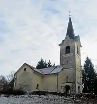 The church in Brdo is located above the hamlet of Goropeče. It is dedicated to the Saint Nicholas. It is a chapel of ease and belongs to the parish of Saint George in Ihan.[3] The church is originally a Gothic single-nave church that was reworked in the Baroque style in 1750, when the bell tower and chapel were added. The sacristy dates from 1718. The rib-vaulted chancel dates to the 14th century and contains paintings by a student of the 15th-century master painter Bolfgang. The church has Renaissance and Baroque furnishings, and the main altar was created in 1669.[4]