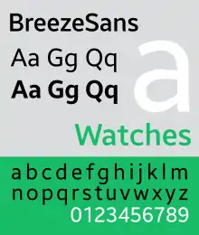 Breeze Sans is a humanist sans-serif typeface for the Latin, Greek, and Cyrillic writing systems designed by Dalton Maag for Samsung. It is the user interface font of the Tizen operating system[2] (starting with Tizen 2.4) and the Samsung Galaxy Watch.