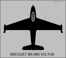 Bréguet recognized that the speed requirements were contradictory and could only be met by a mixed-power design that combined a diminutive Armstrong Siddeley Mamba turboprop in the nose with a Rolls-Royce Nene turbojet in the tail. The Br 960 Vultur ("Vulture") was a low-wing monoplane with an oval-shaped monocoque fuselage and tricycle landing gear. Its two-spar wing featured a swept leading edge and a straight trailing edge which used hydraulic mechanisms to fold vertically. The tailplane was similarly swept and had 16° of dihedral. There was a 600-litre (130 imp gal; 160 US gal) self-sealing fuel tank in the fuselage and a 350-litre (77 imp gal; 92 US gal) self-sealing tank in each outer wing panel. The aircraft accommodated a pilot and copilot sitting side-by-side in a framed canopy.[2]
