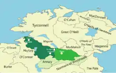 The Kingdom of West Breifne (Irish Breifne Ua Ruairc) or Breifne O'Rourke was a historic kingdom of Ireland that existed from 1256 to 1605, located in the area that is now County Leitrim. It took its present boundaries in 1583 when West Breifne was shired and renamed Leitrim, after the village of Leitrim, which was an O'Rourke stronghold. The kingdom came into existence after a battle between the ruling O'Rourke clan and the ascendant O'Reillys caused the breakup of the older Kingdom of Breifne and led to the formation of East Breifne and West Breifne. The kingdom was ruled by the O'Rourke clan and lasted until the early 17th century, when their lands were confiscated by England.[1]