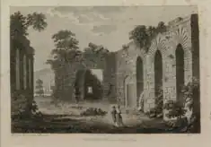 18th century illustration of the ruins of the O'Rourke banqueting hall in their capital of Dromahair