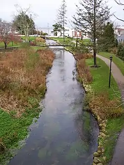 Brewster Gardens (or the Elder Brewster Gardens) is a park located in the center of Plymouth, Massachusetts. The park runs along both sides of Town Brook from the nature trail at the headwaters of the brook, past Jenney Grist Mill, underneath the Market Street and Main Street Extension (Route 3A) bridges to Water Street, across the street from the mouth of the brook, south of Plymouth Rock. Created in the early 1920s, the park covers the original garden plot that was granted to Elder William Brewster in 1620. Located in the park are a bronze statue, The Pilgrim Maiden by Henry Hudson Kitson (1922) and a stainless steel sculpture honoring Plymouth's immigrant settlers from 1700 to 2000.