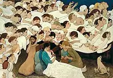 Nativity depicts the birth of Christ. Kershisnik painted Nativity in 2006 while he was a visiting professor at BYU. Kershisnik started the 17-foot-long (5.2 m) painting to create "something ambitious", after encouraging his students to do the same. The painting shows Mary nursing the baby Jesus, two midwives, Joseph, and a dog with her pups underneath a concourse of angels. Kershisnik said that his experiences of the births of his own children felt "densely witnessed" and inspired the painting.[4] He also explained the iconography of the dog as a representation of fidelity and faithfulness, a common symbol in religious art.[4] Bren Jackson, an art critic, wrote that the midwives exemplify the "fellowship of sisterhood"[17] and Kershisnik adds that he would imagine that there would have been women there to help Mary.[4] In the painting, Joseph is nearby, but separate from Mary and her child, and has an overwhelmed expression. The angels have distinct faces, which according to Jackson, invites viewers to consider what their role in observing the birth could have been.[17] In an essay on Nativity, Jackson wrote that the way Mary puts her hand on Joseph's hand to comfort him even after she has just given birth reminds viewers of their humanity.[18]:251