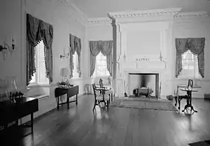 The interior is not symmetrical, with an offset central hallway extending halfway into the house. A parlor occupies two bays on the south side, while a ballroom occupies three bays of the north side. The ballroom is among the largest of its kind, larger and more impressive than the ballroom in the similar Hammond-Harwood House.Interior detailing is late Georgian in style. The ballroom fireplace is a direct copy of a design from Abraham Swan's stylebook British Architect of 1745. It was once considered that architect William Buckland executed these designs, but it is now thought to have been the work of William Brampton, who completed them between 1769 and 1772. The second floor comprises four bedrooms. The end pavilions contain a kitchen and servants' quarters on the east side and a carriage house on the west side, connected by a narrow passage through the hyphens, which themselves each contain two rooms.[4]