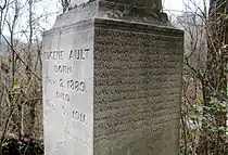 On June 8, 1902, memorial services led by local doctor and pastor E. S. Dickson were held at the Briceville Community Church for victims of the Fraterville Mine disaster, a mine explosion that killed 216 miners at the Fraterville Mine just north of Briceville. Another mine disaster took place at the Cross Mountain Mine about a mile west of the church on December 9, 1911, killing 84 miners. Many of the victims of this explosion were buried in a circular formation known as the Cross Mountain Miners' Circle on the slopes of Walden Ridge,[5] although several were buried in the Briceville Community Church Cemetery, among them Eugene Ault (1889–1911), whose monument is inscribed with the "farewell message" Ault had written on a wall of the mine as he lay dying.[1]