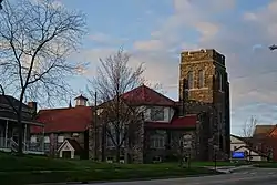 Brick Presbyterian Church is a historic Presbyterian church in Perry, Wyoming County, New York. The Gothic Revival-style church was built in 1909 of randome ashlar Pennsylvania limestone. It consists of a central octagonal structure housing the sanctuary surrounded by wings that give the structure a cruciform appearance. It features a massive square crenellated bell tower. It is a product of the Buffalo architectural firm of Green & Wicks.[2]
