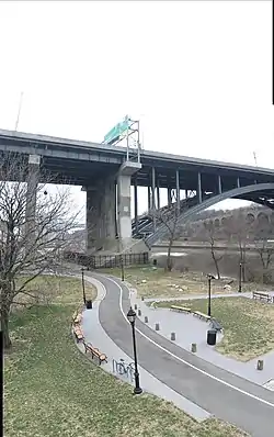 Land for this park was gradually acquired by the City of New York between 1884 and 2011. The oldest of the parcels was along the Bronx side of Washington Bridge, where winding trails and steps descended from the bridge's landing in the Morris Heights neighborhood to the Harlem River's shoreline. The bridge was conceived by Parks Commissioner Andrew Haswell Green. An early advocate of expanding the City of New York, he envisioned the bridge as symbolic of the unity between Manhattan and the Bronx. The bridge was completed in 1889 and was named after the country's first president on the centennial of his inauguration.[1] The construction of Major Deegan Expressway (I-87) in 1939 and Cross-Bronx Expressway (I-95) in 1955 greatly reduced some of the parkland on the Harlem River shoreline in favor of highway ramps connecting Washington Bridge to the two highways.