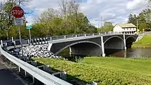 The Bridge in West Earl Township, as it is designated on the National Register of Historic Places, is also known by its historic name, Big Conestoga Creek Bridge No. 12. It carries Farmersville Road (unsigned SR 1010) across the Conestoga River at Brownstown, West Earl Township, Pennsylvania, in the United States. The bridge is notable for its form, a three-span, continuous, arched concrete girder that does not touch the abutments. Designer Frank H. Shaw was a consulting engineer to Lancaster County when the bridge was constructed in 1917, but appointed county engineer that same year.[2] The bridge was replaced with a new three-span structure in 2019.[3] It is now known as the Sergeant Melvin R. Wink Memorial Bridge.