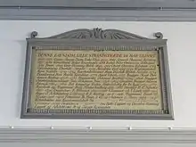 The four-bay median risalit and decorations on the facade date from the expansion of the building in 1773–1776. The gate was not moved when the house was expanded and is therefore not placed in the centre of the building. This has been solved by placing the gate and an undecorated window in a slightly recessed portion of the median risalit.[19]