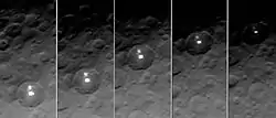 The brightest cluster of spots ("Spot 5") is located in an 80-kilometer (50 mi) crater called Occator.[1][2] The largest and brightest component of the cluster is in the center of the crater, with dimmer spots located towards this crater's eastern rim. Early in the orbital phase of the Dawn mission, the high albedo of these spots was speculated to be due to some kind of outgassing,[3] and subsequent closer images helped scientists determine that it is a material with a high level of reflection, and suggested ice and salt as possibilities.[4] These bright features have an albedo of about 40%, four times brighter than the average of Ceres's surface.[5]