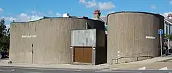 The northern side of Edward Street dates entirely from the 1960s and 1970s and is lined with "prominent buildings" such as the church, which has an "unusual figure-of-eight design".[6] The building is in two parts linked by an offset flat-roofed entrance bay. The longer left-hand section is oblong inside but with a "sinuous" kidney-shaped exterior.[7][18] To the right is a smaller circular- or oval-shaped worship space lit by a round roof lantern.[7] The left-hand worship space is also top-lit with square shafts; the exterior is entirely windowless, consisting of vertically laid concrete blocks in a pattern emulating stretcher bond brickwork.[7] The softening effect of the curved exterior walls provides a contrast to their "starkly unperforated" mass;[18] the "smooth angular entrance building" is also a contrast.[18] The interior worship space is lined with brickwork.[7]
