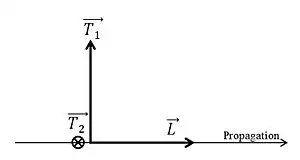 In practice, six Brillouin lines of interest are generally seen in a Brillouin spectrum. Acoustic waves have three polarization directions one longitudinal and two transverse directions each being orthogonal to the others. Solids can be considered nearly incompressible, within an appropriate pressure regime, as a result, longitudinal waves, which are transmitted via compression parallel to the propagation direction, can transmit their energy through the material easily and thus travel quickly. The motion of transverse waves, on the other hand, is perpendicular to the propagation direction and is thus less easily propagated through the medium. As a result, longitudinal waves travel more quickly through solids than transverse waves. An example of this can be seen in quartz with an approximate acoustic longitudinal wave velocity of 5965 m/s and transverse wave velocity of 3750 m/s. Fluids cannot support transverse waves. As a result, transverse wave signals are not found in Brillouin spectra of fluids. The equation shows the relationship between acoustic wave velocity, V, angular frequency Ω, and phonon wavenumber, q.[1]