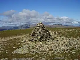 The summit of Brim Fell bears a fine slate cairn on grass, with a second big cairn to the north east. The views are extensive although the long whale-backed ridge tends to limit the foreground.[6]