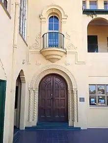 The main entrance to the school is located on the northern frontage, which is two storeyed and divided into five bays. The central bay is gabled and features the main entrance doorway; the doorway is arched and set in a decorated rectangular frame. The two bays which flank the central entrance bays are arcaded with verandahs above, while the two outer bays have paired arched windows and tiled awnings.[1]