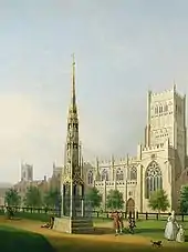 As Bristol prospered, the cross became an obstruction to traffic. In 1733 a nearby silversmith John Vaughan who occupied the building later known as the Dutch House complained that the cross threatened his life and property whenever there was a high wind and so persuaded the magistrates to have the cross taken down. The parts were stored in the guildhall until Alderman Price and other citizens arranged for it to be erected again in spring 1736 on College Green by the cathedral. It was there admired as a quaint antiquity but it only took thirty years for it once again to be thought an obstruction. This time, the complaints came from the visitors who had come to the spa of Hotwells. They were wont to promenade on the green in line abreast and the cross impeded the great numbers so inclined – lines of eight or more. A fund was collected to improve the green as a promenade but this was exhausted in raising the green. The cross was once again removed in August 1762, and the pieces of the cross lay disassembled in the great cloister of cathedral. In October 1764, Dean Cutts-Barton then gave it to Henry "the Magnificent" Hoare and the materials except the very worn lower columns were carted away to adorn his grand estate of Stourhead in Wiltshire, where it was rebuilt in 1765.[3] It remains there now in the care of the National Trust.