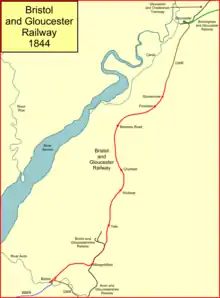 The Bristol and Gloucester Railway was a railway company opened in 1844 to run services between Bristol and Gloucester. It was built on the 7 ft (2,134 mm) Brunel gauge, but it was acquired in 1845 by the 4 ft 8+1⁄2 in (1,435 mm) standard gauge Midland Railway, which also acquired the Birmingham and Gloucester Railway at the same time.