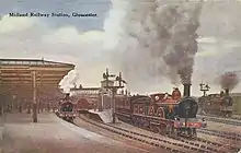 The trains used Temple Meads station at Bristol; a half-mile connecting line at Lawrence Hill had been constructed under powers of 27 June 1843.[2] At Gloucester the Birmingham and Gloucester had established a station when it opened on 4 November 1840; it was located in the angle of what is now Station Road and Bruton Way. The Bristol and Gloucester opened a platform on the north side of that, its route curving in from the south and south-east so that the respective routes crossed on the approach to the stations. There were six passenger trains each way daily; from the beginning double line was not available throughout, but it was provided after a short time. Coal traffic started operating on 9 September 1843.[2][9]