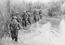 The infantry battalion consisted of the battalion Headquarters (HQ), HQ company (signals and administration platoons), four rifle companies (HQ and three rifle platoons), a support company with a carrier platoon, mortar platoon, anti tank platoon and pioneer platoon.[30] The rifle platoon had a HQ, which included a 2-inch mortar and an anti tank weapon team, and three rifle sections, each containing seven riflemen and a three-man Bren gun team.[31]