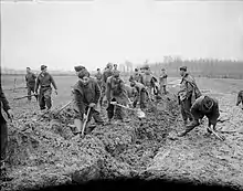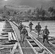 The 1939 infantry division had a theoretical establishment of 13,863 men. By 1944, the strength had risen to 18,347 men.[25] This increase in manpower resulted mainly from the increased establishment of a division's subunits and formations; except for certain specialist supporting services, the overall structure remained substantially the same throughout the war. A 1944 division typically was made up of three infantry brigades; a Medium Machine Gun (MMG) battalion (with 36 Vickers machine guns, in three companies, and one company of 16 4.2-inch mortars); a reconnaissance regiment; a divisional artillery group, which consisted of three motorised field artillery regiments each with twenty-four 25-pounder guns, an anti-tank regiment with forty-eight anti-tank guns and a light anti-aircraft regiment with fifty-four Bofors 40 mm guns;[26] three field companies and one field park company of the Royal Engineers; three transport companies of the Royal Army Service Corps; an ordnance field park company of the Royal Army Ordnance Corps; three field ambulances of the Royal Army Medical Corps, a signals unit of the Royal Corps of Signals; and a provost company of the Royal Military Police.[26] During the war, the Royal Electrical and Mechanical Engineers was formed to take over the responsibility of recovering and repairing vehicles and other equipment. A division generally had three workshop companies, and a recovery company from the REME.