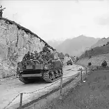 In the winter of 1940–41, new armoured regiments were formed by converting the remaining mounted cavalry and yeomanry regiments. A year later, 33 infantry battalions were also converted to armoured regiments.[27] By the Second Battle of El Alamein, in late 1942, the British Army had realised that an entire infantry brigade was needed within each division, but until mid 1944, the idea that the armoured and motorised infantry brigades should fight separate albeit coordinated battles persisted.[39] By the Battle of Normandy in 1944, the divisions consisted of an armoured brigade of three armoured regiments and a motorised infantry battalion, and an infantry brigade containing three motorised infantry battalions. The division's support troops included an armoured car regiment, an armoured reconnaissance regiment, two field artillery regiments (one of which was equipped with 24 Sexton self-propelled 25-pounder guns), one anti–tank regiment (with one or more batteries equipped with Archer or Achilles tank destroyers in place of towed anti–tank guns) and one light anti–aircraft regiment, with the usual assortment of engineers, mechanics, signals, transport, medical, and other support services.[31][40][41]