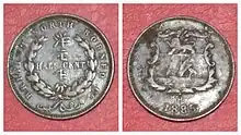 Coins were first minted in values of 1⁄2 cent and 1 cent in copper, and later 1 cent, 2+1⁄2 cents, and 5 cents in copper-nickel, and 25 cents in silver. Originally they were issued under the name "British North Borneo Co", as The British North Borneo Company had the right to produce coin under its Royal Charter granted in 1881. Later they were minted under "State of North Borneo", starting in 1903. All coins depicted the company/state coat of arms on the obverse and denomination on the reverse. These were last minted in 1941 and later phased out and replaced by coins of the Malayan dollar.