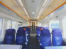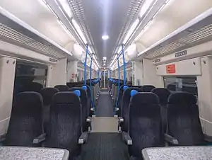 In May 2015, unit 375301 was moved from Ramsgate Depot to Derby Litchurch Lane Works for a full refurbishment. On 16 May 2015, it was returned to the Kent depot wearing a new livery, similar to, but not based on the 'Highspeed' livery carried by the high speed Class 395 EMU, with a more vibrant shade of blue on the saloon doors and bolder stripes to highlight First Class and Disabled areas. Internally, the unit has received new carpets and lino flooring, new table top covers and the grab poles, side panels and table legs have been re-powder coated. The existing seat covers have been retained, but were dry cleaned to provide a brighter, cleaner interior. This work will also involve combining the two separate First Class sections on four car units into one section in the end of MOSL coach. It is intended for all class 375 units to receive this refurbishment between 2015 and 2018. The original plan was for the first 50 units (375/3s, 375/6s and 375/7s) to be refurbished at Bombardier in Derby and then the remaining units would be transferred for refurbishment at Bombardier Ilford. This plan did not go ahead and the 375/8s and 375/9s were sent to Derby. On 19 September 2015 the last 375/3 unit no 375310 went to Derby for refurbishment. The following week on 26 September the first 375/6 went to Derby for refurbishment.[5] The final 375 to receive the refurbishment and gain the new blue Southeastern livery was 375 920, which was returned to Ramsgate depot on 28 April 2018.