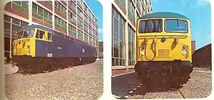 BREL's Doncaster Works were in heavy demand at this time and its resources would be stretched to meet these targets due to a lack of skilled personnel to manufacture mechanical components.[4] Instead the Ashford, Eastleigh and Swindon Works produced sub-assemblies; roofs, fuel tanks and cab frames were produced at Ashford, while cab desks were built at Eastleigh, and radiator housings were supplied from Swindon.[4] Final assembly was transferred from Doncaster Works to Crewe Works, allowing Doncaster to commence work on the new Class 58 heavy freight locomotive.[4]