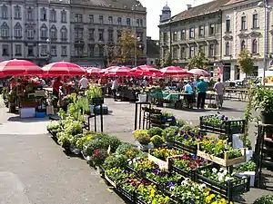 British Square (Croatian: Britanski trg), colloquially known as Britanac (lit. 'the Brit'), is a public square in the city of Zagreb, Croatia.[1] It is one of the few remaining squares to include an open-air farmers' marketplace with fresh fruit, vegetables and other foods brought directly from farms,[2] and is a revered urban area among the population of Zagreb.[3] Britanski trg is located along Ilica Street, a few blocks west from the main city square, Ban Jelačić Square. It is also a transport hub—it is an endpoint for several bus lines, while the city tram lines 1, 6 and 11 stop on its south side.[4] The square itself is convenient for access to several elite upscale neighborhoods of Zagreb, such as Pantovčak and Zelengaj.[5] The open air market is held daily from early morning until about noon, and an antiques fair is held at the square each Sunday.[6][7]